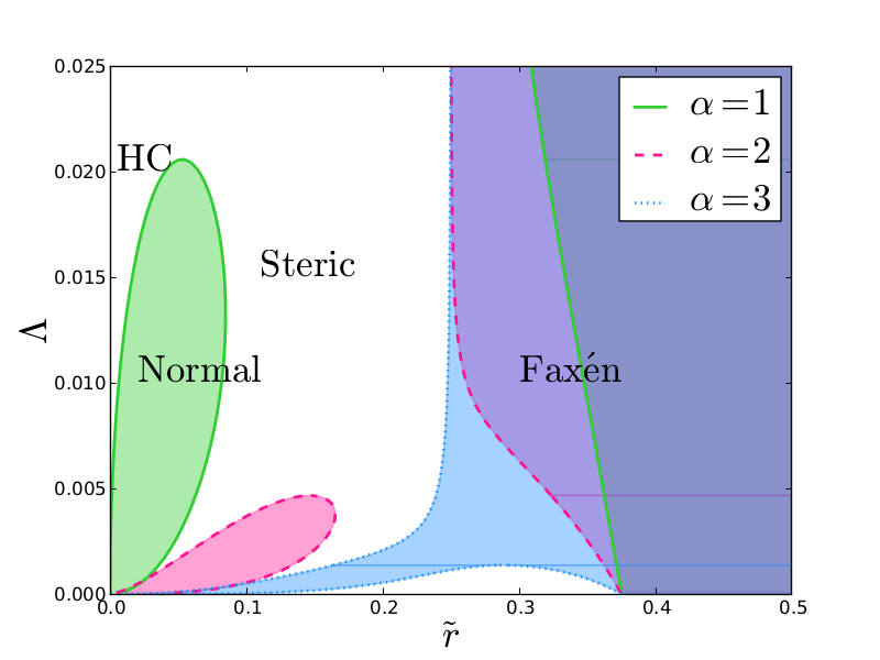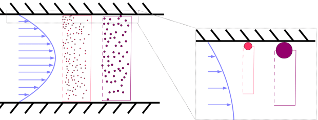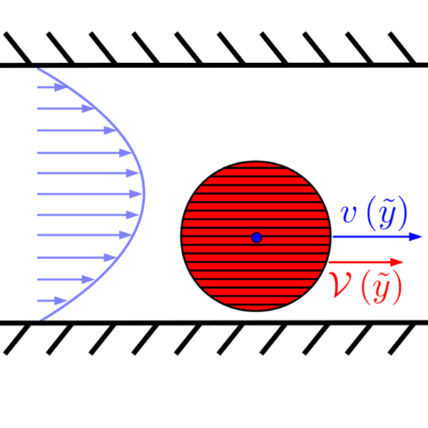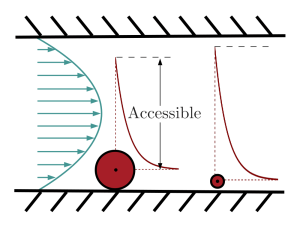 We were happy to have a unified theory but found that when we let the particle size approach the channel height the particle was predicted to go 50% faster than the fluid — a highly unlikely thing. So we went back and added a bit more hydrodynamics: We integrated the stress on the particle due to the fluid flow. Because the fluid profile is parabolic, the particle moves slightly slower than the carrier fluid, which of course means that the particles elute later than if this effect were neglected.